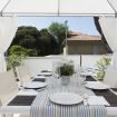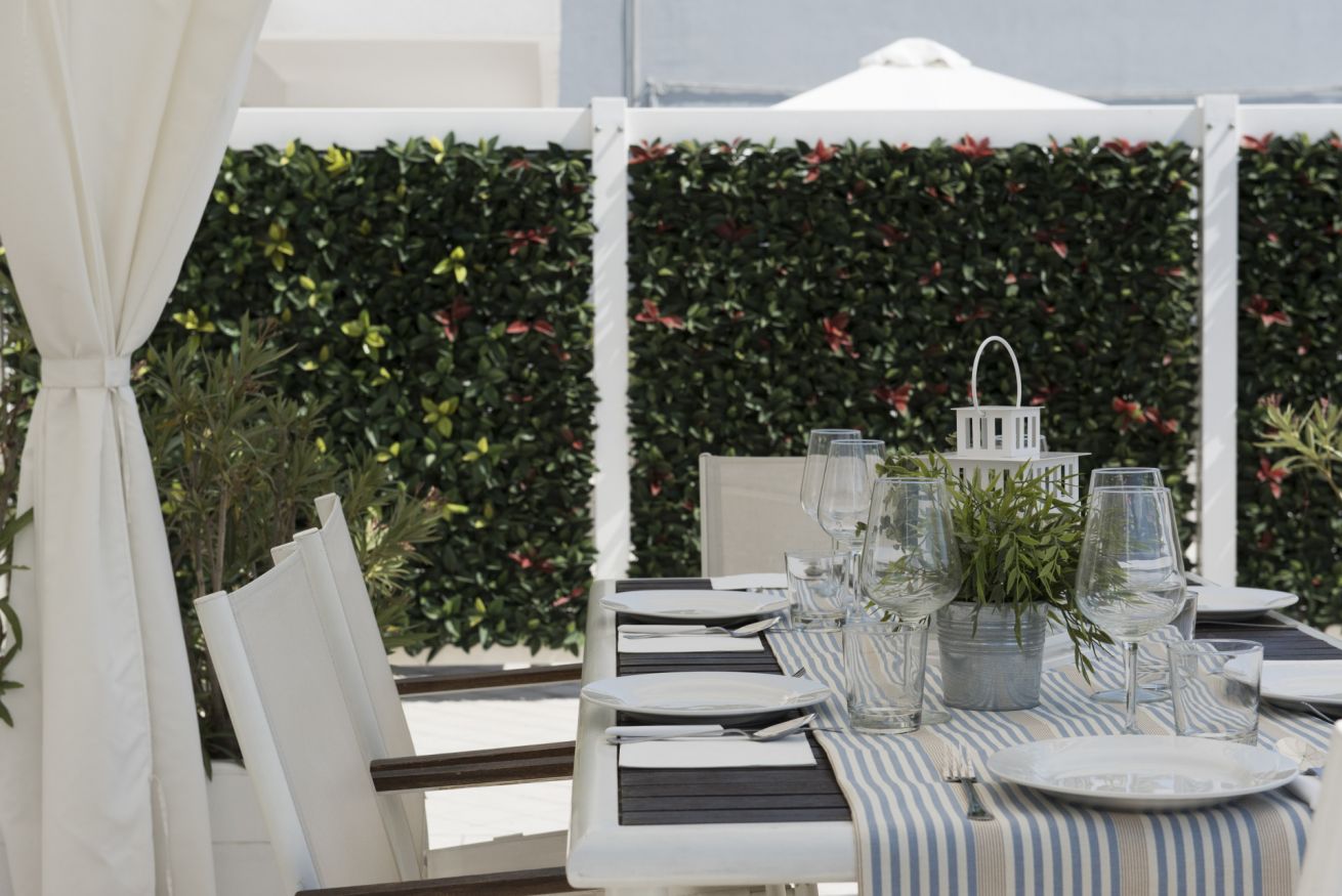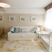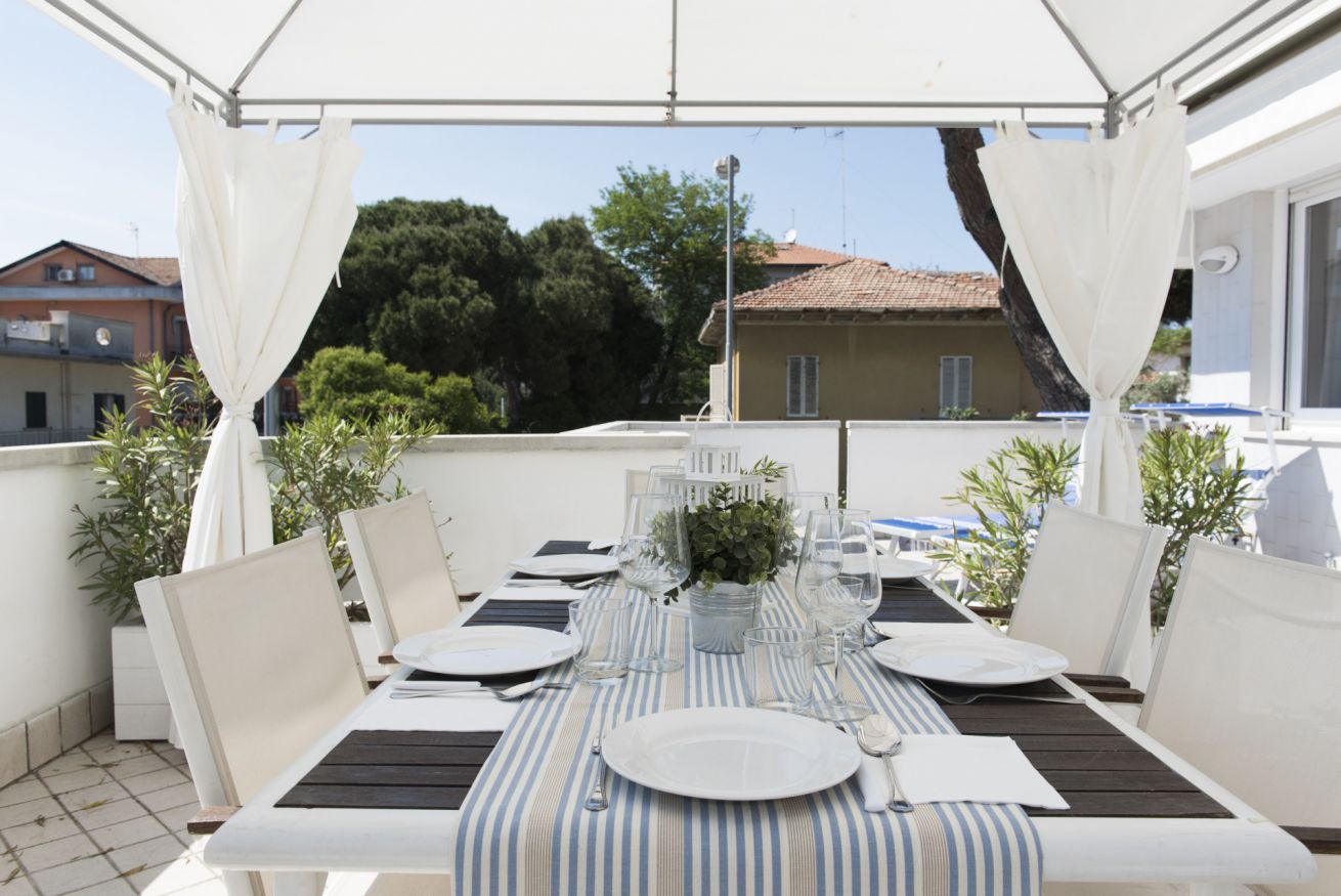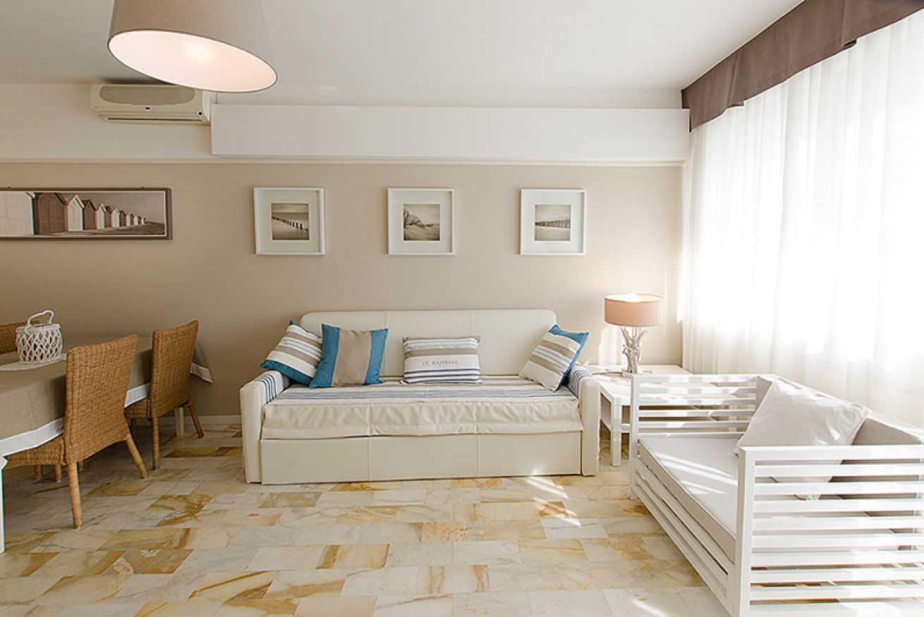 Il soggiorno, luminoso e declinato con eleganza sui toni del bianco e beige, con accesso all’ampia terrazza completa di gazebo con tavolo e sedie e lettini prendisole, è composto da cucina a vista dotata di lavastoviglie, zona pranzo, living con divano letto e due poltrone, smartTV.